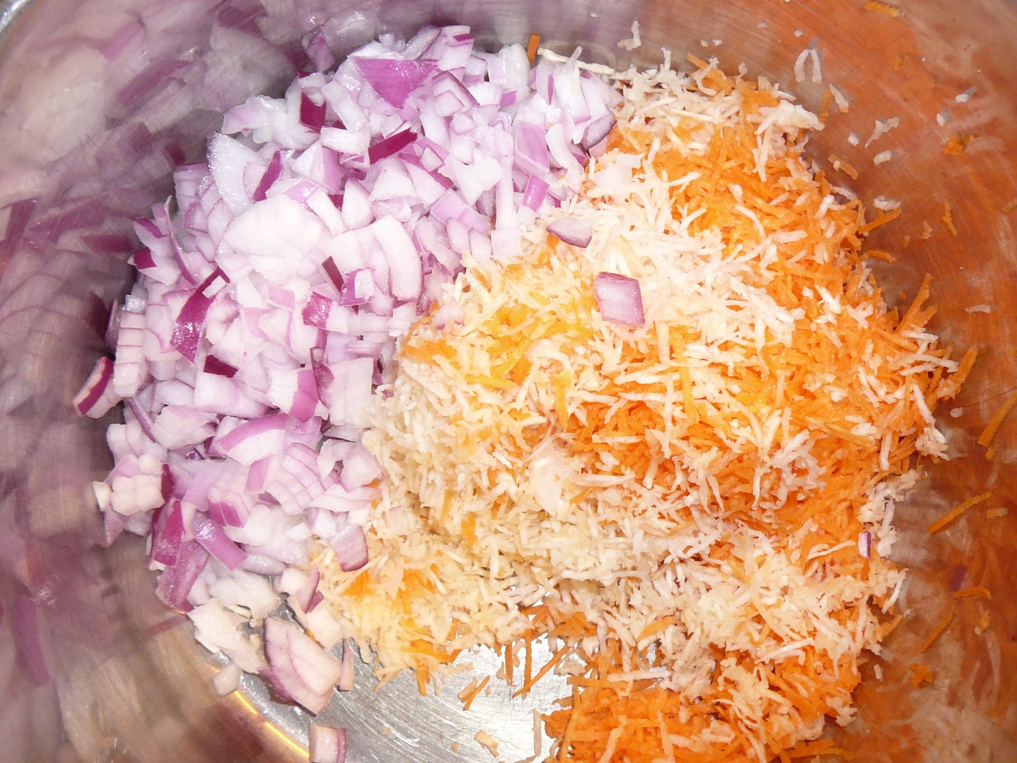 A hagymát apró kockákra vágom, a sárgarépát és zellert apró lyukú reszelőn lereszelem.