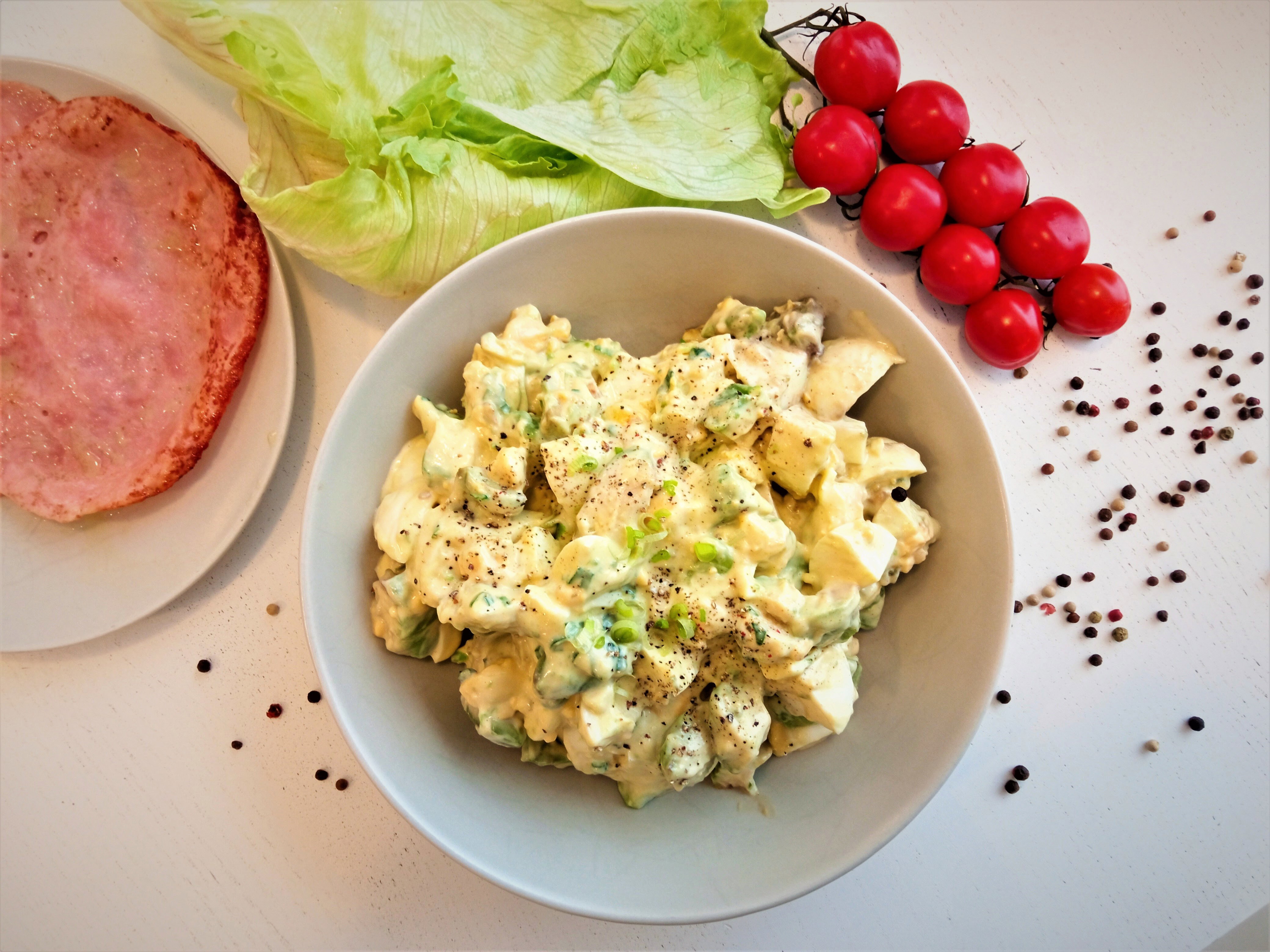 A fiam külön kérésére „legyártottam” a töltött tojást, májpástétommal, kínai ötfűszer keverékkel, tejfölös majonézzel nyakon öntve, ahogy azt kell, de maradt még pár főtt tojás, ami feldolgozásra várt. Érett, puha avokádóm is volt itthon, így nem volt kérdés, mit fogok készíteni. Mindkét alapvető hozzávalót kedvelem, és salátába összekeverve különleges, egészséges, tápláló, és ugyanakkor roppant finom harapnivalót kapok. Amennyiben a tojásfőzéssel nem kell foglalkozni, pillanatok alatt elkészíthető ez a saláta. Ajánlani tudom tehát azoknak is, akik csupán perceket tudnak a konyhában tölteni, de ínycsiklandó fogással szeretnének kedveskedni a családnak. Bár az sem kellene, hogy eltántorítson senkit a saláta elkészítésének szándékától, ha időt kell szánni a tojásfőzésre, mert nem szükséges nagy gasztronómiai szaktudás ahhoz, hogy valaki a tojást keményre megfőzze, és azt sem lehet mondani, hogy órákat venne igénybe. Hozzávalók: 6 + 1 db. tojás 2 db. avokádó 150–200 ml olaj a majonézhez 1/2 ek mustár a majonézhez 2 kk citromlé 1 szál zöldhagyma, a szárával együtt só, bors Elkészítés: Hat tojást keményre főzök. A hagymát felaprítom. Egy tojássárgájából, a mustárból és olajból majonézt kavarok, beleteszem a citromlevet, a hagymát, és sózom, borsozom. A sóval nem kell szégyenlősen bánni, mert a tojások kérik a sót, de természetesen vigyázzunk arra, hogy ne adagoljuk túl. A megfőtt, kihűtött és megpucolt tojásokat nagyobb kockákra vágom, majd a héjából kiemelem a félbevágott avokádókat és hasonló méretű kockákra vágom őket. Egy nagyobb edényben a fűszeres majonézt óvatosan összeforgatom a tojás és avokádó kockákkal. Az óvatosság csupán esztétikai meggondolásból fontos: mutatósabb az étel, ha nincsenek túlságosan összetörve az alkotóelemei. Pirított sonkával, valamint jégsalátával tálalom. Szénhidrátcsökkentett diétát követők is bátran fogyaszthatják, de kitűnően harmonizál frissen sült kenyérrel vagy akár pirítóssal is. Aki szereti a hagymás ételeket, lelkiismerete szerint növelheti a hagymaadagot. A gyerekek ízlését követve én diszkréten szoktam a hagymával bánni. Mitöbb, egy kis csípősséget is simán elbírna ez az isteni tojássaláta, de ez egy gyerekbarát változat, így ez most kimaradt belőle. Csípősen vagy sem, érdemes kipróbálni.