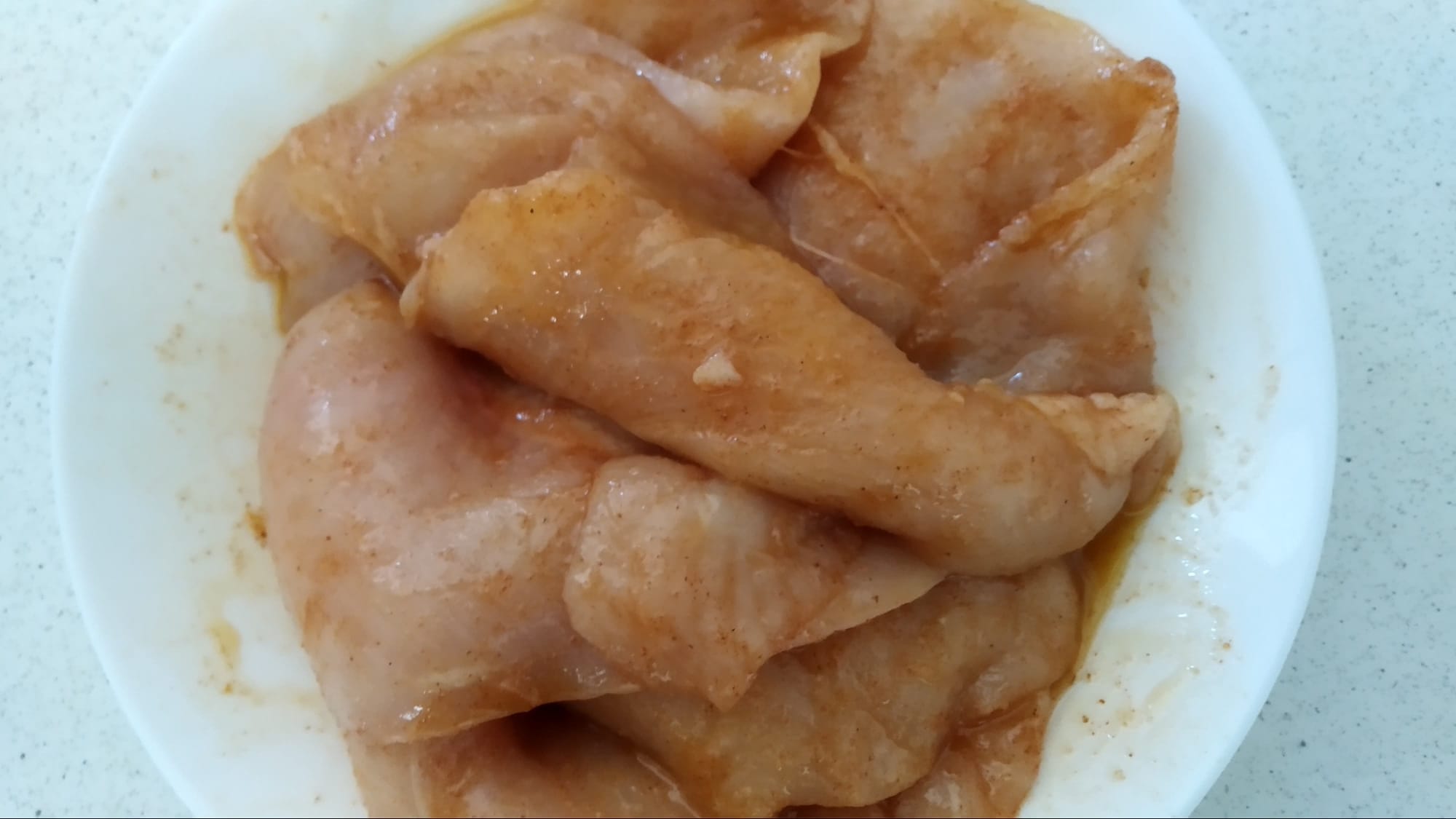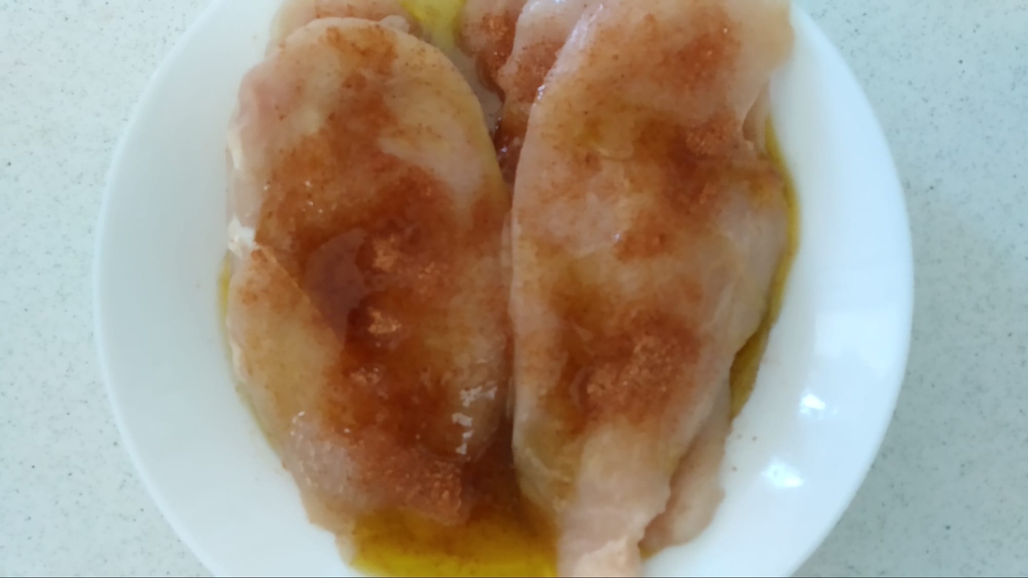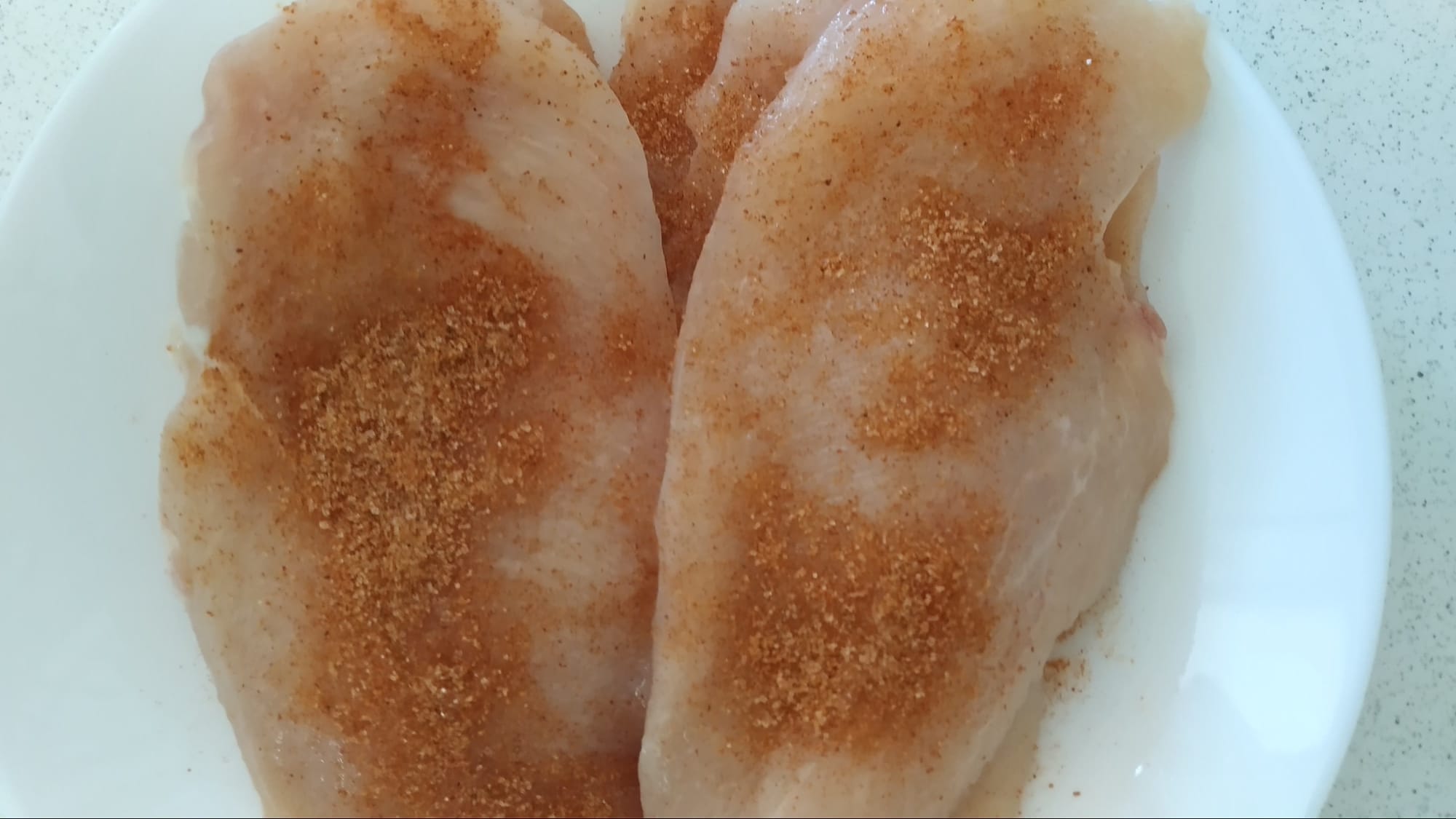 A felszeletelt csirkemelleket egyenként befűszerezem a csirkesült fűszerkeverékkel (én a Kotányi-féle csirkesült keveréket használom), pici kurkumát is szórók rá, leginkább a színe miatt. Úgy szoktam csinálni, hogy kiteszek 2 szelet húst, azokat bővebben befűszerezem, majd ráteszem a következő két szeletet, és azokat is bővebben befűszerezem, majd a következő kettőt és így tovább. Így csak egyik oldalukat kell fűszerezni (mindig a felsőt), a csirkemell alsó oldala befűszereződik magától, mivel az előző szelet felső oldaláról ráragad a fűszer. Ezzel is időt spórolok.