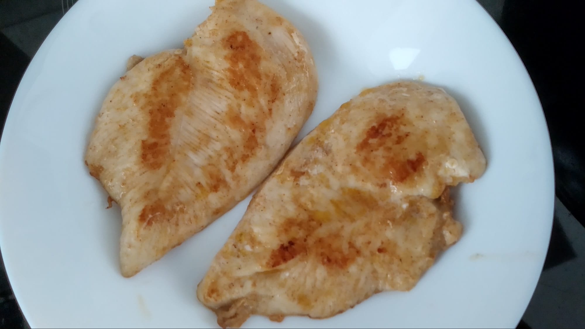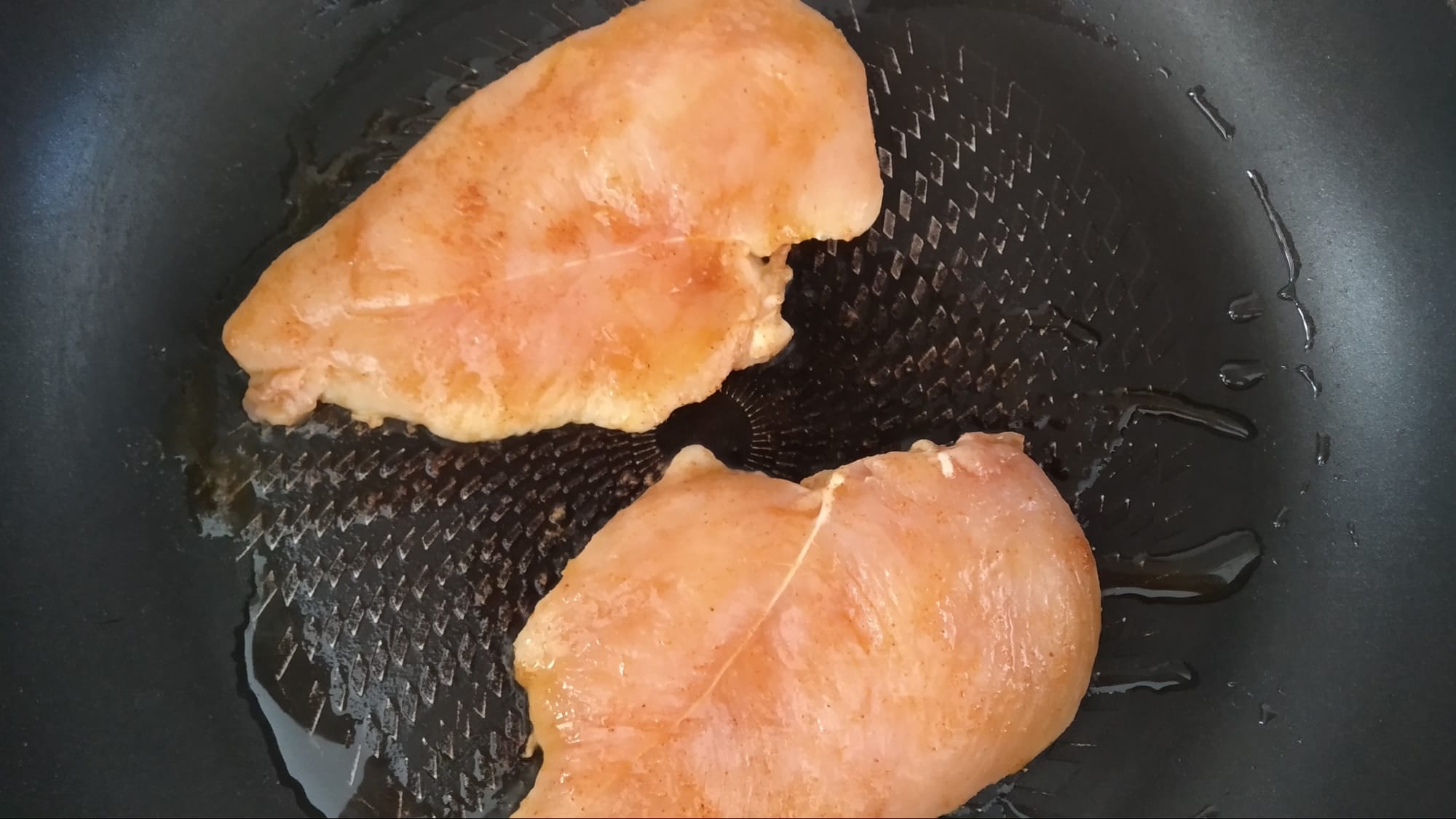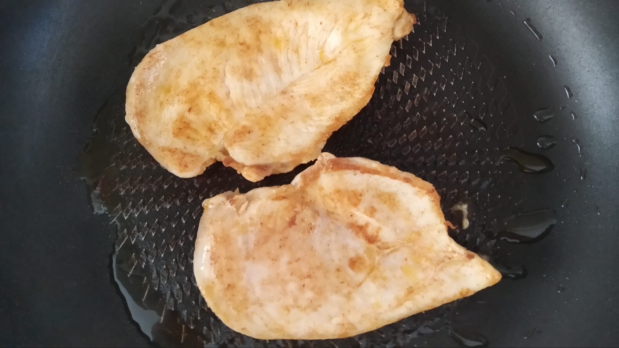 A fűszerezés kb. 3-4 percet vesz igénybe. Fél kanálnyi napraforgó olajat teszek a serpenyőbe és felforrósítom, beleteszem a csirkemellet és vastagságától függően körül-belül 3-4 percig sütöm.