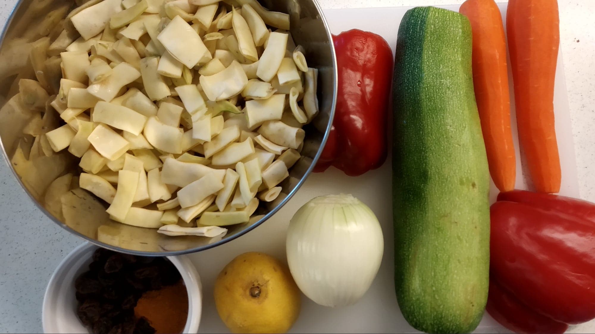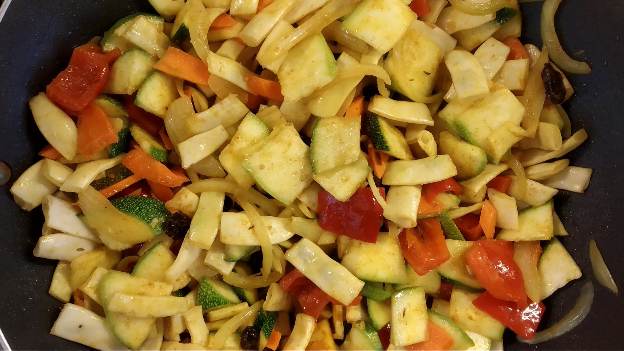 A forró olaj kihozza a fűszerkeverék különleges aromáját. Hozzáadom a többi zöldséget, a mazsolát, öntök rá egy fél deci vizet és megsózom. Fedő alatt 25 percig alacsony lángon párolom, majd hozzáadom a paradicsompürét és még 5 percig folytatom a párolást. Ellenőrzöm, hogy a paszuly megfőtt-e, ha az megpuhult, akkor a többi zöldség biztosan készen van.