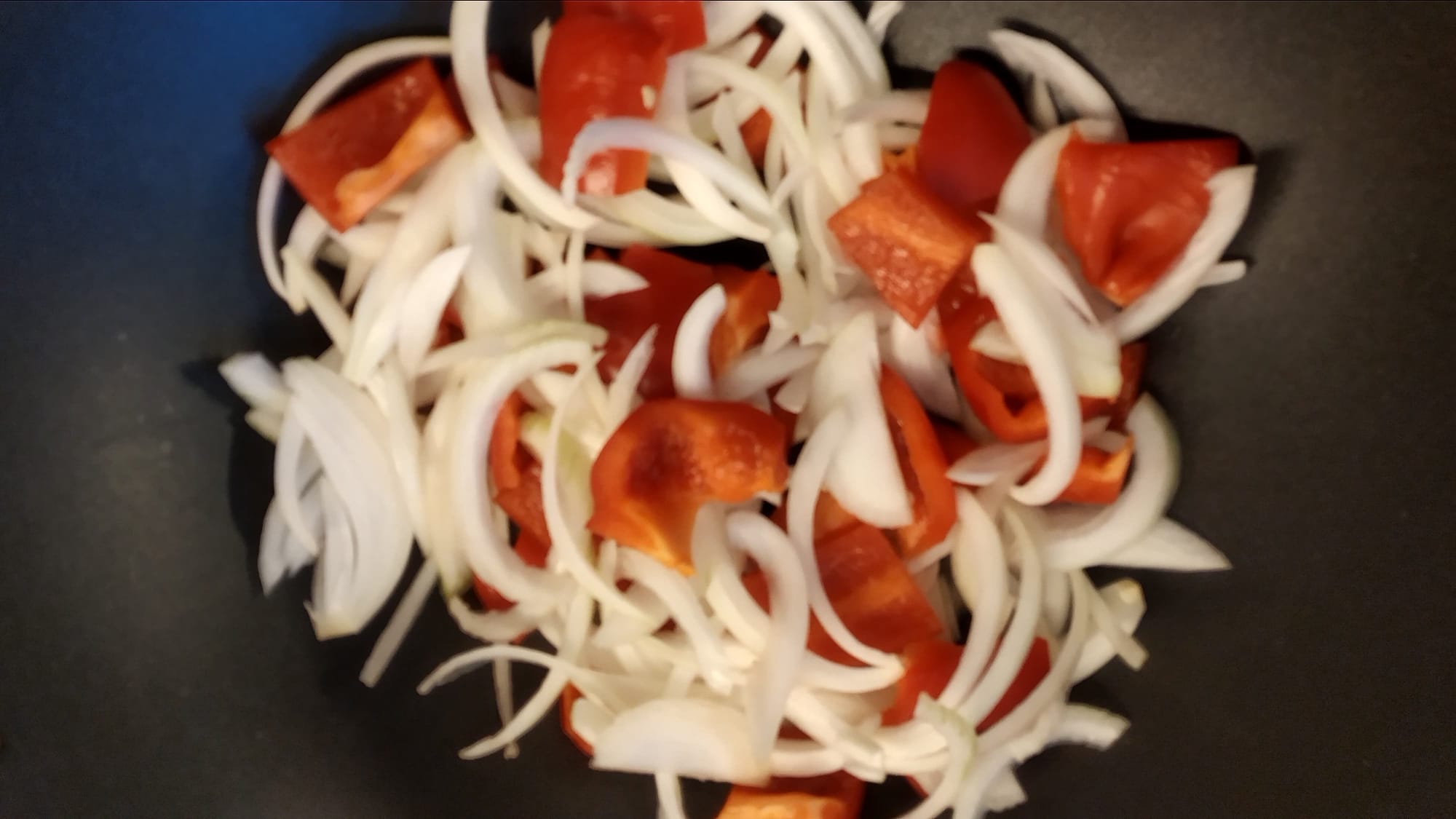A hagymát és a paprikát kevés olajban 2-3 percig pirítom majd ráteszem a curry fűszerkeveréket és jól összeforgatom.
