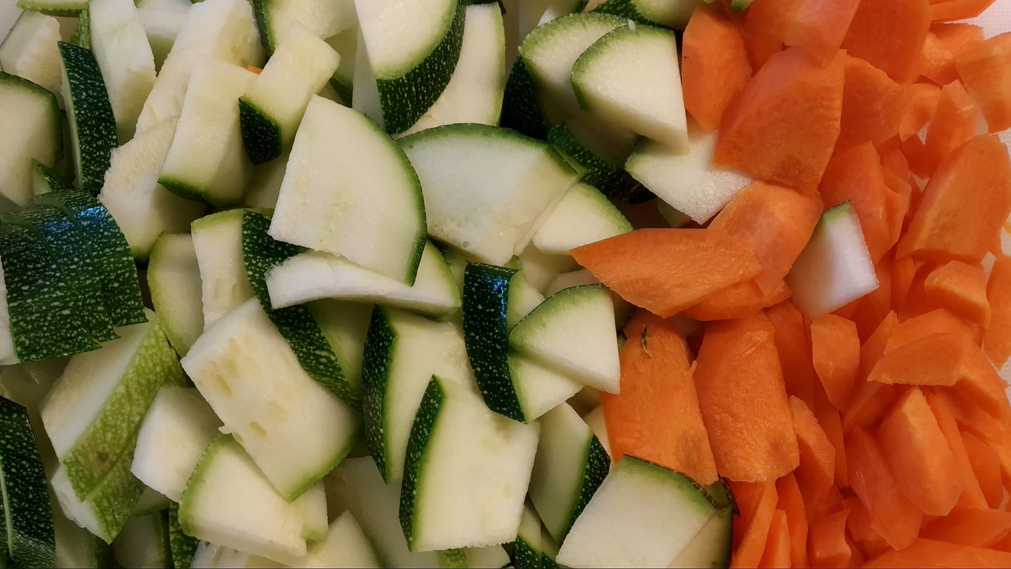 A hagymát szeletekre, a paprikát nagyobb kockákra vágom, a paszulyt kisebb darabokra töröm, a cukkinit és a sárgarépát nagyobb, de nem túl vastag darabokra szeletelem.