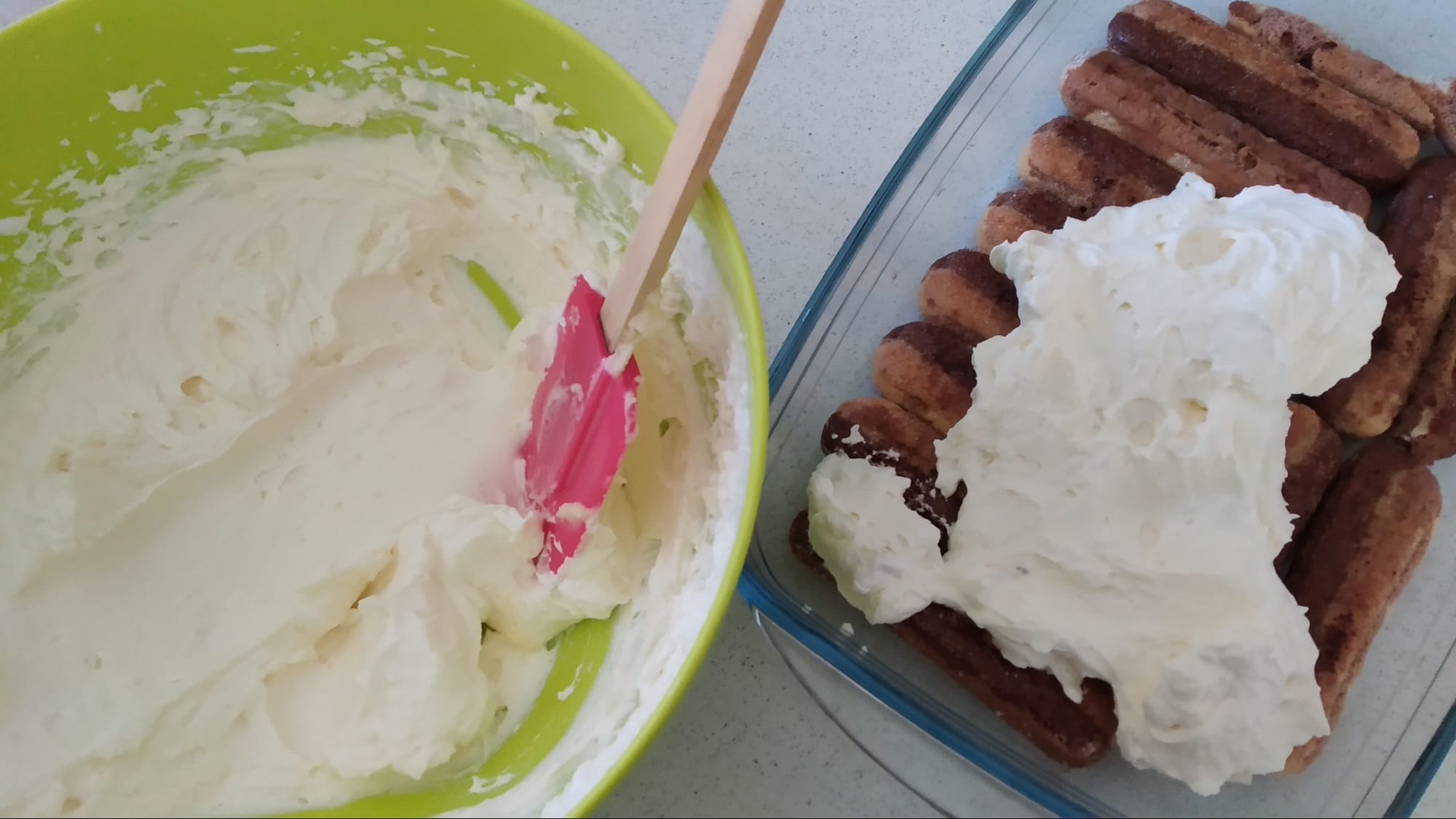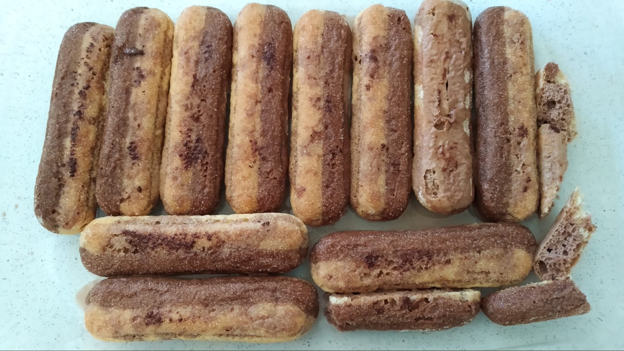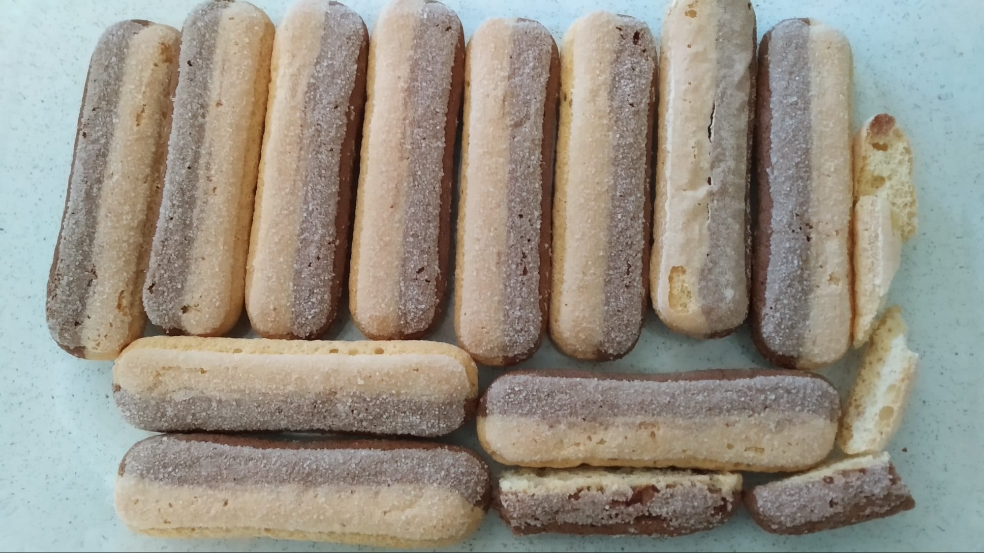 Az üvegtál aljára teszek egy sor babapiskótát. Igyekszem a teljes alját kirakni. Ha marad a szélén hely, de nem fér be egy piskóta, akkor egy hosszú, éles késsel, határozott mozdulattal félbevágom a száraz babapiskótát. Így a hossza akár egyben is marad, nem törik el, de ha eltörik az sem gond, mert a végeredményen úgysem fog látszani, a lényeg az, hogy próbáljuk az edény alját teljesen kirakni a babapiskótákkal.