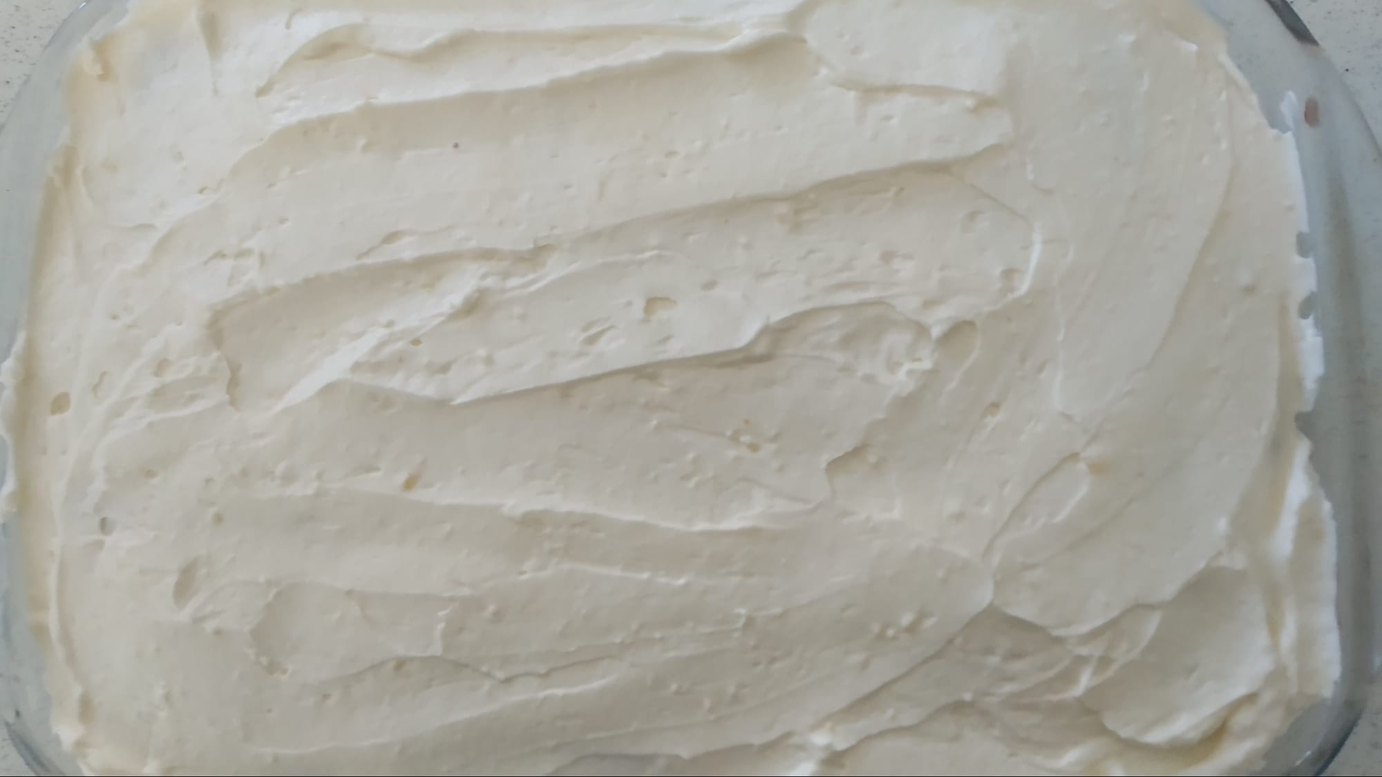Egy nagyobb tálba öntöm a habtejszínt és jó keményre felverem. Fontos, hogy hűtőhideg legyen a tejszín, akárcsak a tej, amiből a krémet készítem. Amikor jó kemény a tejszínhab, beleteszem a készre kevert vaníliás krémet, a mascarponét és a cukrot/édesítőt.