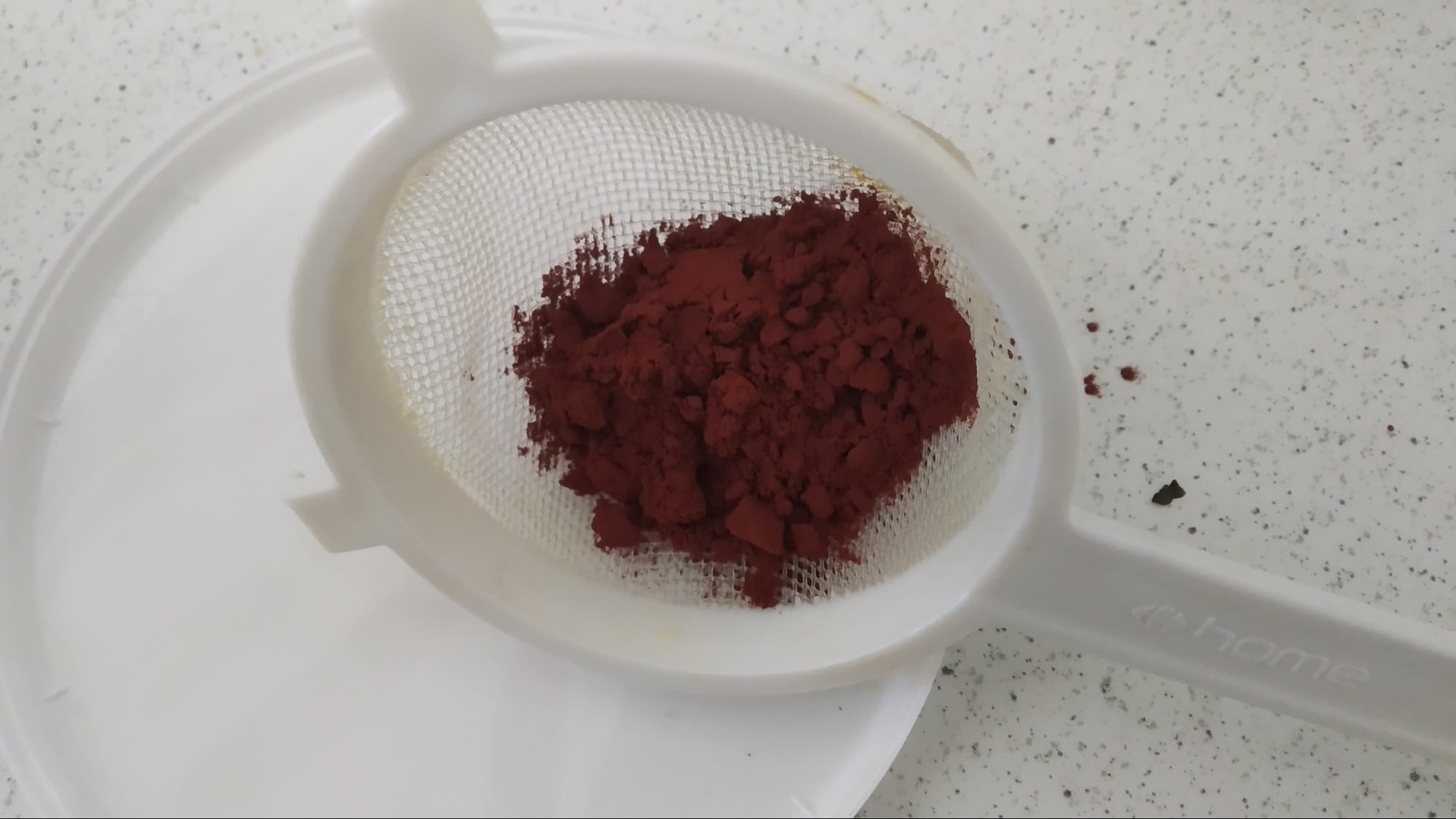 Egy teaszűrőbe teszek egy kiskanál kakaóport és a szűrőt ütögetve rászitálom a tetejére.
